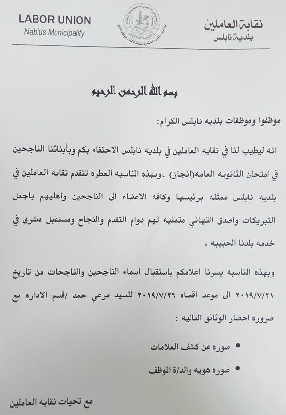 نقابة العاملين في بلدية نابلس تنشر إعلاناً بخصوص الناجحين في الثانوية من أبناء العاملين.
