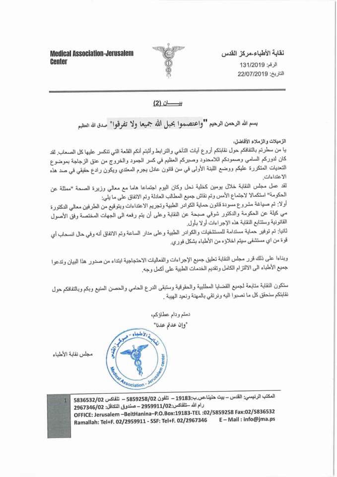 نقابة الأطباء تعلن عن تعليق جميع الإجراءات والفعاليات الاحتجاجية وتدعو جميع الأطباء للالتزام بتقديم الخدمات الطبية.