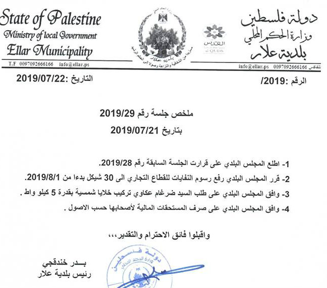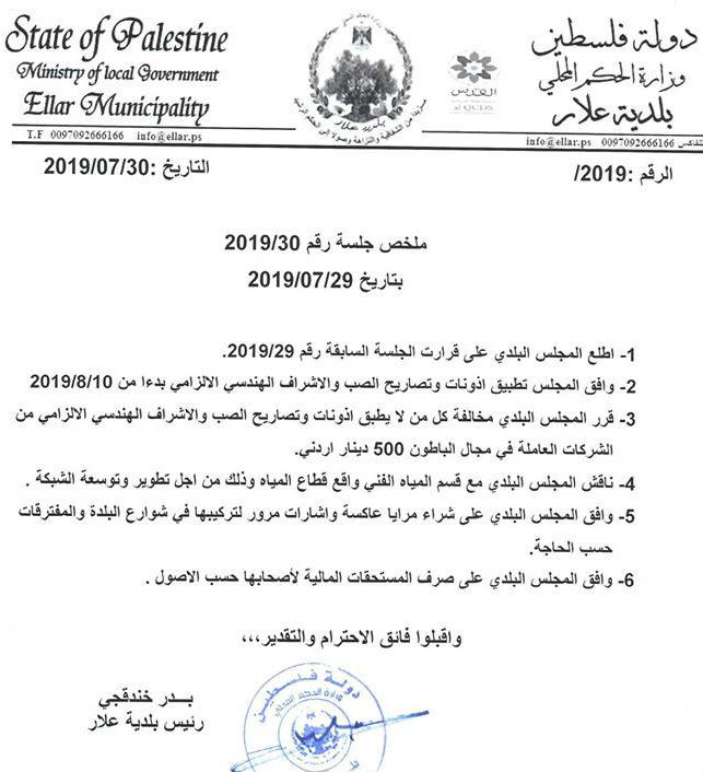 بلدية علار تعقد اجتماعها الدوري وتخرج بعدة قرارات، منها فرض غرامة مالية للمخالفين بخصوص أذونات الصب.