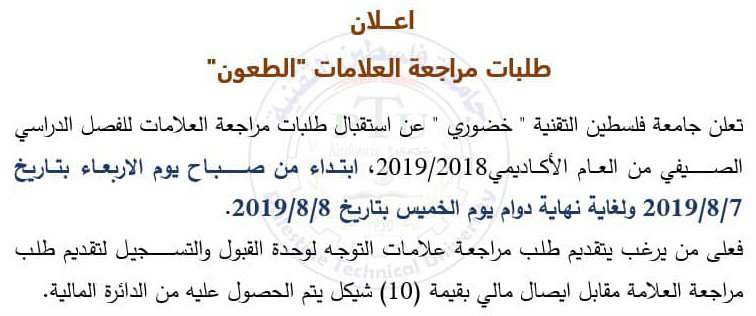 جامعة خضوري تعلن عن بدء استقبال طلبات مراجعة العلامات للفصل الدراسي الصيفي 2018-2019.