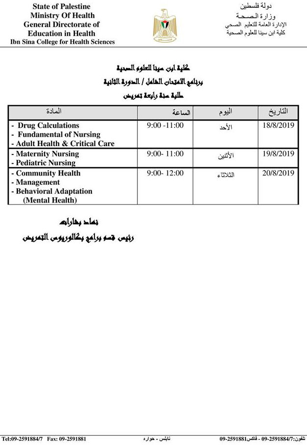 كلية عندليب العمد للقبالة والتمريض تنشر مواعيد الامتحان الشامل في دورته الثانية لطلبة سنة رابعة في الكلية.