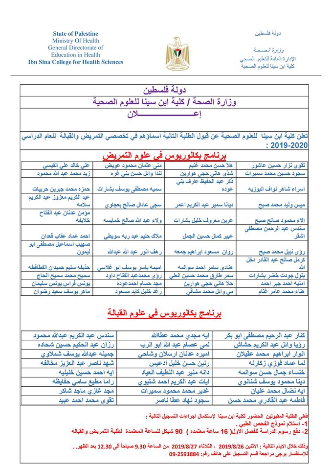 كلية ابن سينا للعلوم الصحية تنشر أسماء المقبولين في تخصصي التمريض والقبالة للعام الدراسي 2020/2019.