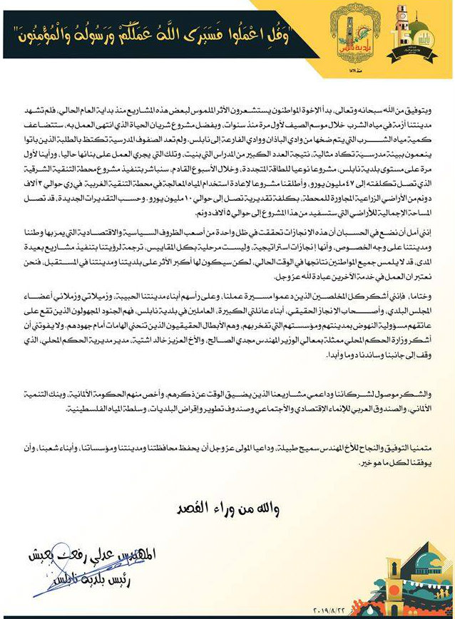 كلمة يعيش بمناسبة تسليم مهام رئاسة بلدية نابلس