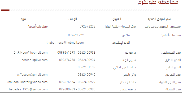 وزارة الصحة تنشر خريطة الخدمات لتسهيل التواصل مع المستشفيات ومراكز الصحة والمديرية في طولكرم.