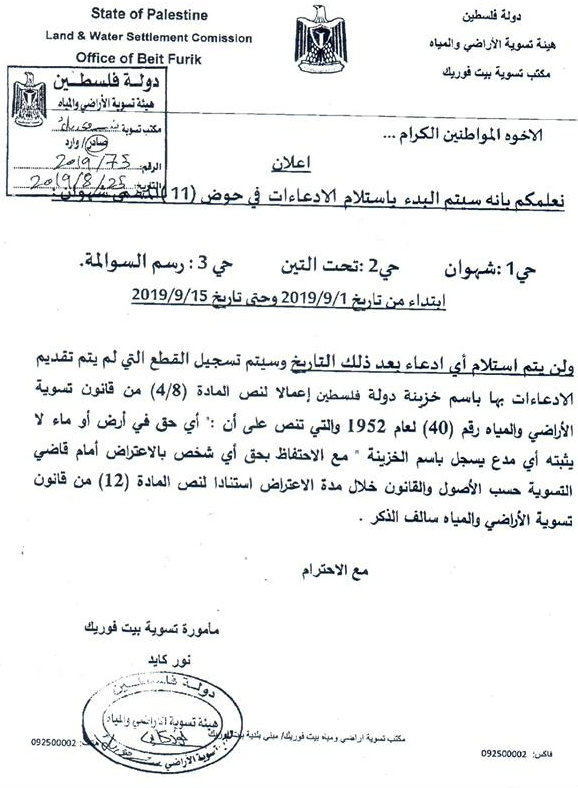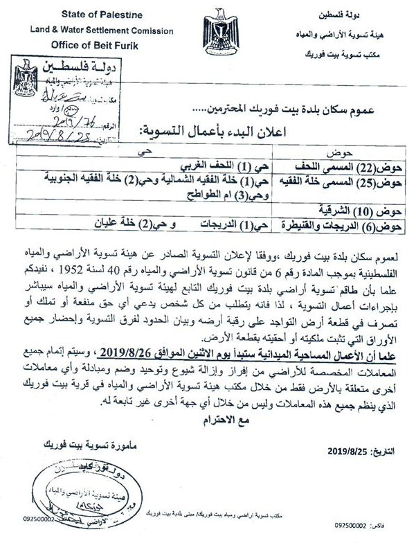 مكتب تسوية بيت فوريك يعلن عن البدء بأعمال التسوية في عدة أحواض.