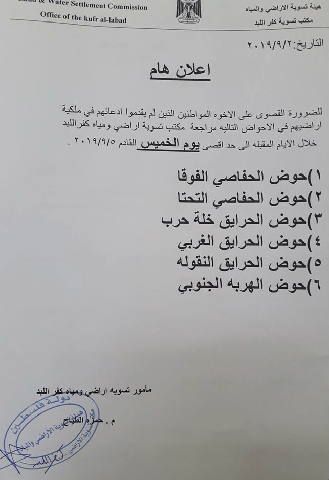مكتب تسوية كفر اللبد ينشر أسماء أحواض ويدعو أصحابها لمراجعة المكتب بأسرع وقت.