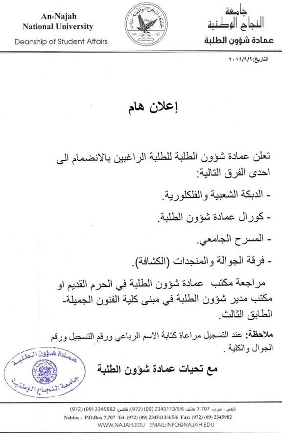 عمادة شؤون الطلبة في جامعة النجاح تعلن عن البدء بالتسجيل للمنتخبات الرياضية في الجامعة.