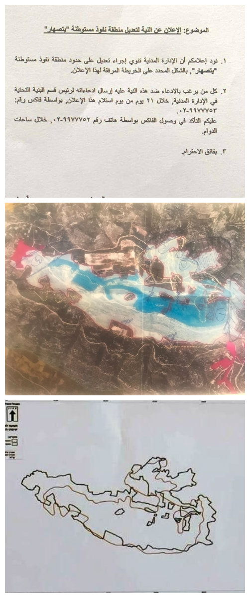 دعت عيادة عوريف أصحاب الأراضي المجاورة لمستوطنة يتسهار والتي تقع ضمن المنطقة المضللة بالأبيض، تقديم الاعتراضات فورا حتى لا يتم مصادرة هذه الأراضي حسب ما ورد من الارتباط الفلسطيني.