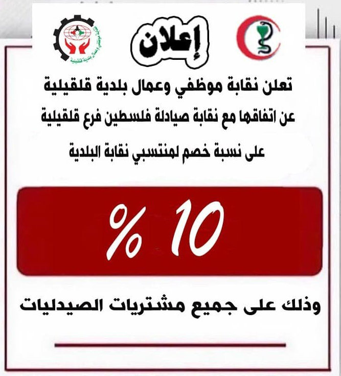 نقابة موظفي وعمال بلدية قلقيلية تعلن عن نسبة خصم للموظفين العاملين في البلدية على مشتريات الصيدليات.