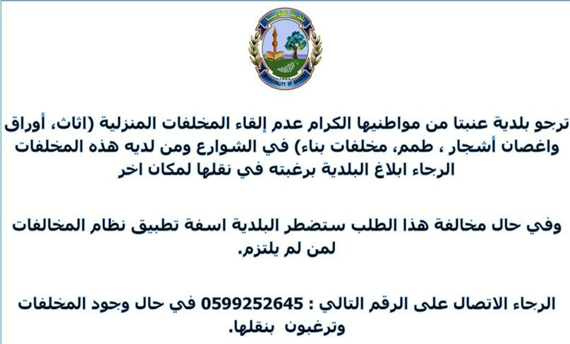 بلدية عنبتا تدعو المواطنين لعدم إلقاء المخلفات المنزلية في الشوارع وإلا ستطبق نظام المخالفات.