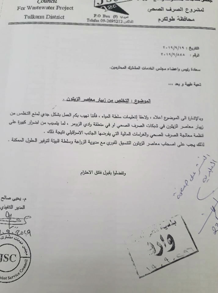 مجلس الخدمات المشترك لمياه الصرف الصحي في منطقة الشعراوية يناشد بعدم إلقاء نفايات عصر الزيتون في شبكات الصرف الصحي والوديان.