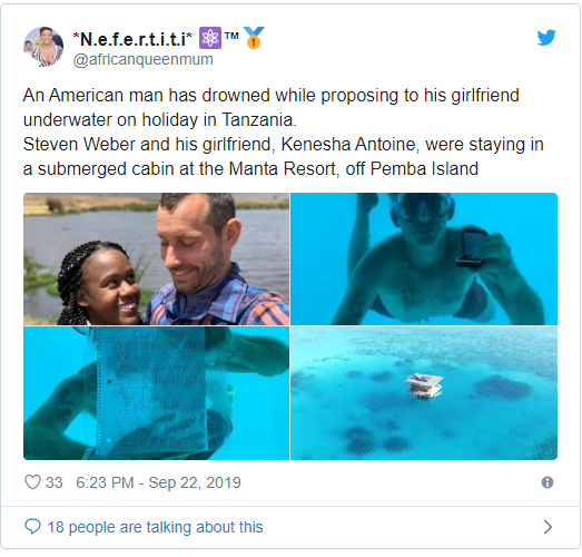 وفي هذا السياق كشفت إدارة المنتجع لهيئة الإذاعة البريطانية أن طاقم العمل هرع للتعامل مع "مشكلة في الماء"، لكن عند وصولهم "لم يكن بالإمكان فعل أي شيء". وبعد الحادث الأليم كتبت كينيشا على الفيسبوك أن حبيبها "لم يعد من الأعماق". وفي منشور لاحق على الفيسبوك كتبت الشابة الأمريكية أن ستيفن "لم يعش ليسمع ردّي" على طلب الزواج. وأضافت: "لم نتعانق أو نحتفل به (...). تحول أفضل يوم في حياتنا إلى أسوأ أيامنا".