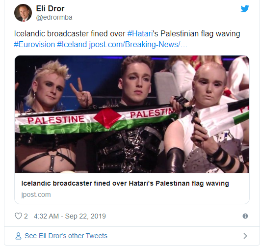 أكد اتحاد البث الأوروبي (EBU)، يوم الأحد (22 أيلول/سبتمبر 2019)، لوكالة الأنباء الألمانية (د.ب.أ) أنه سيتم تغريم الإذاعة الأيسلندية العمومية (RUV) بسبب عرض صور لفرقة "هاتاري" الأيسلندية لموسيقى الروك وهي تحمل أعلاماً فلسطينية خلال مسابقة الأغنية الأوروبية (يوروفيجن). وقال الاتحاد إن الصور تمثل انتهاكاً للحظر الذي يفرضه على البيانات السياسية خلال المسابقة. ولم تتضح قيمة الغرامة بعد.