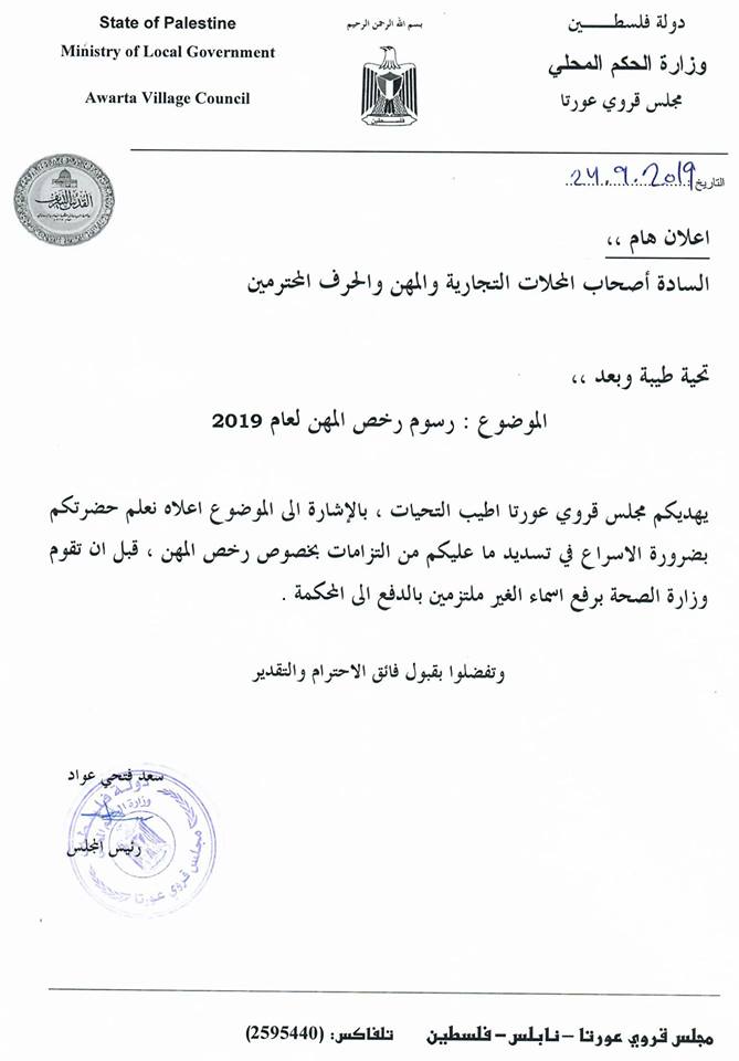 مجلس قروي عورتا يدعو أصحاب المهن والحِرف لتسديد رسوم الرّخص.