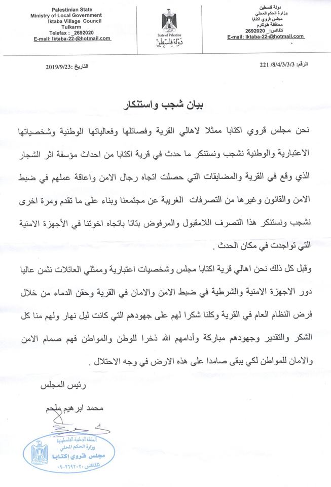 مجلس اكتابا يصدر بيانا على خلفية شجار وقع في القرية وأدى إلى مضايقة رجال الأمن.