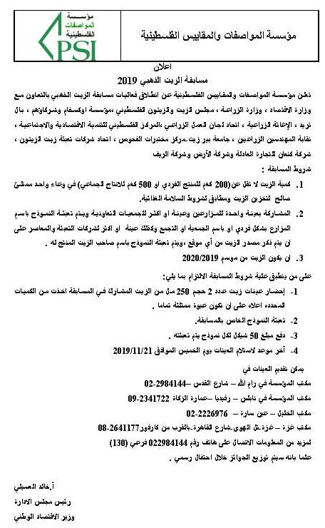 مؤسسة المواصفات والمقاييس تعلن عن انطلاق فعاليات مسابقة الزيت الذهبي ضمن شروط محددة.