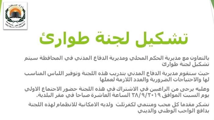 بلدية كفر ثلث تدعو لحضور الاجتماع الأولي حول مهام لجنة الطوارئ المشكلة من قبل الحكم المحلي والدفاع المدني.