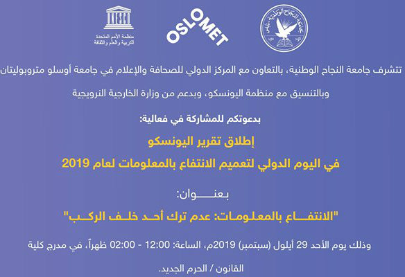 تدعوكم جامعة النجاح، بالتعاون مع المركز الدولي للصحافة والإعلام في جامعة أوسلو متروبوليتان، بالتنسيق مع منظمة اليونسكو وبدعم من وزارة الخارجية النرويجية، للمشاركة في فعالية: