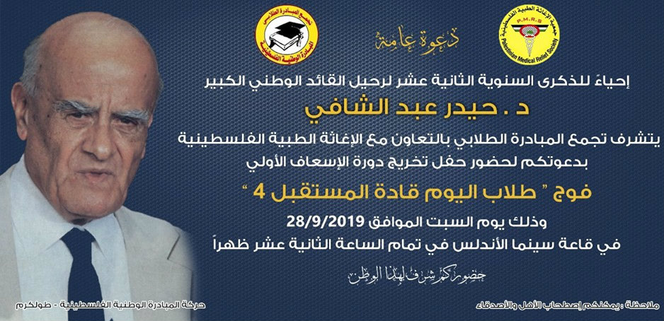 بحضور أمين ورئيس جمعية الإغاثة الطبية الفلسطينية مصطفى البرغوثي، تدعوكم المبادرة الوطنية الفلسطينية لحضور حفل تخريج من خريجي دورات الإسعاف الأولى والمتقدم " تدريب مدربين" التي أقامها تجمع المبادرة الطلابي في خضوري، تحت إدارة وإشراف الإغاثة الطبية الفلسطينية في طولكرم، بقيادة المدرب القانوني والمعتمد المسعف عدي الجلاد، على شرف الذكرى السنوية لرحيل القيادي الوطني الإنساني حيدر عبد الشافي.