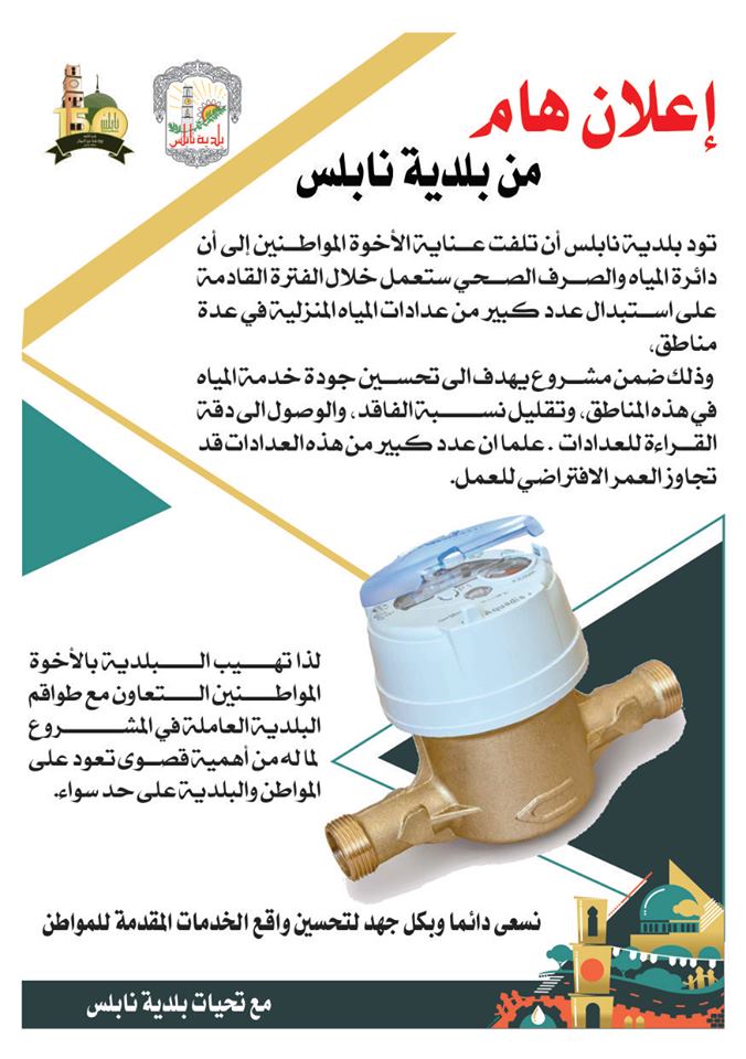 بلدية نابلس تعلن عن تحسين جودة خدمة المياه وتنوه إلى استبدال بعض عدادات المياه المنزلية.