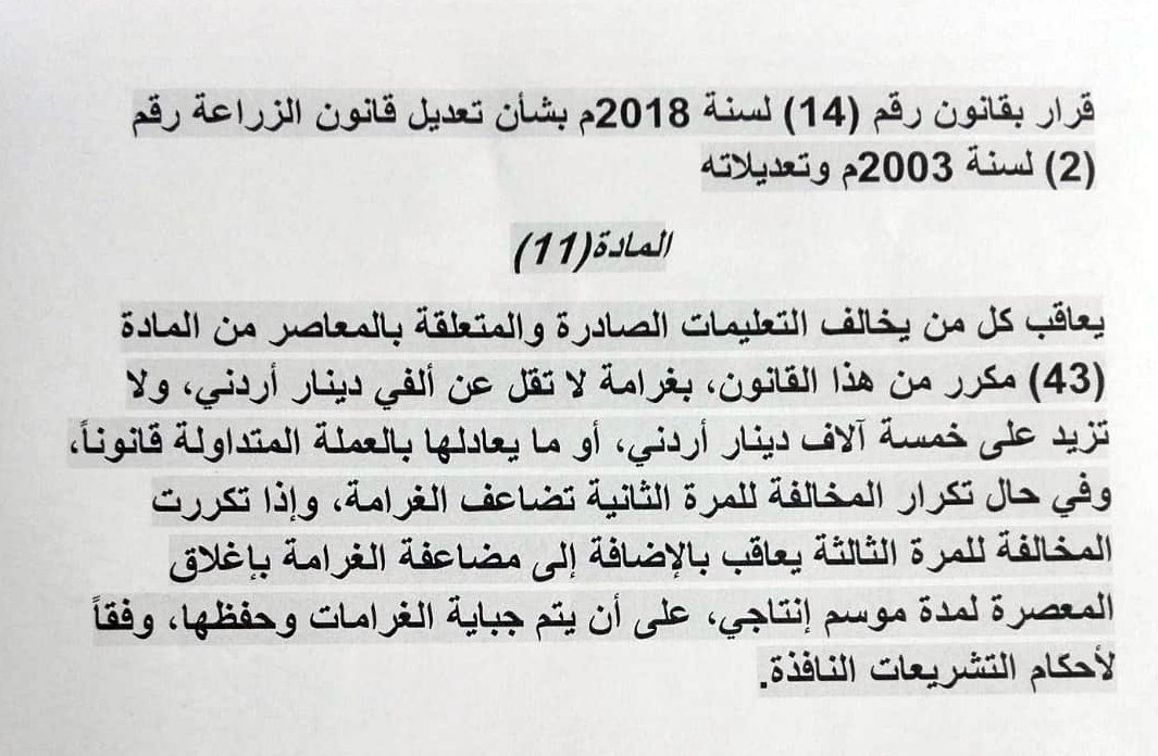 وأكدت المديرية أنها ستحول كل صاحب معصرة مخالف للتعليمات إلى القضاء، لاتخاذ الإجراءات القانونية بحقه، بناء على مادة رقم 11 من قرار بقانون رقم 14 لعام 2018.