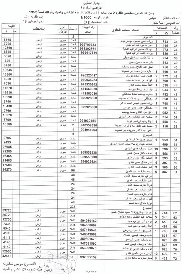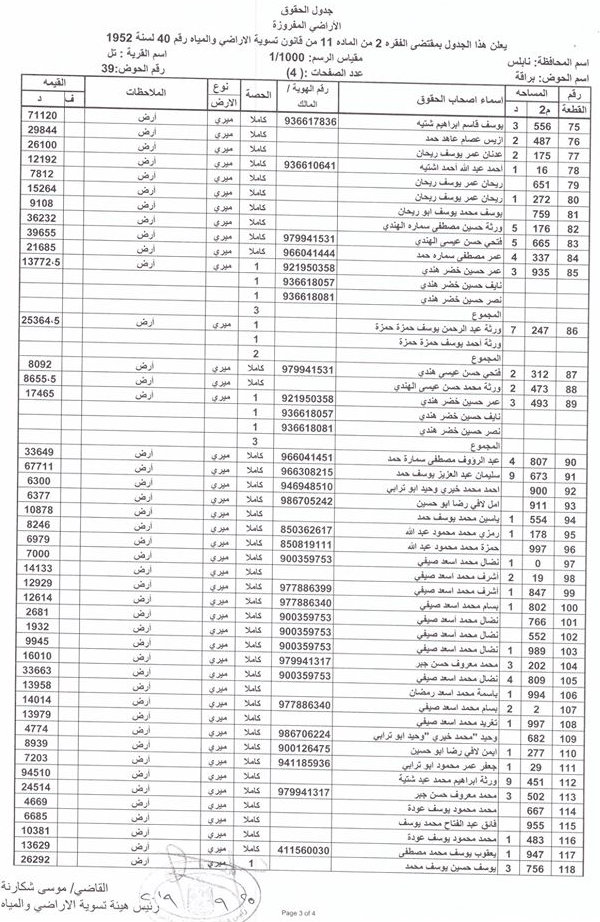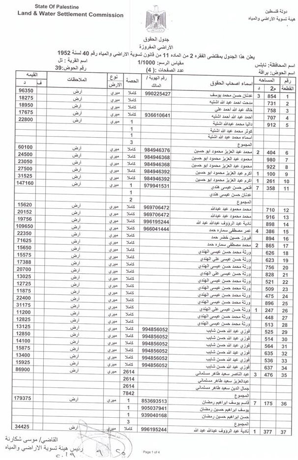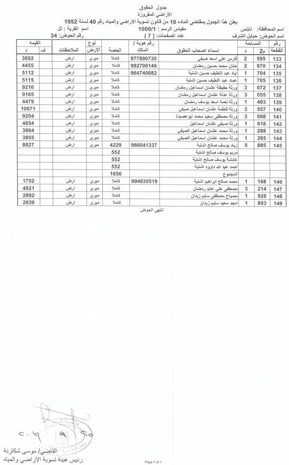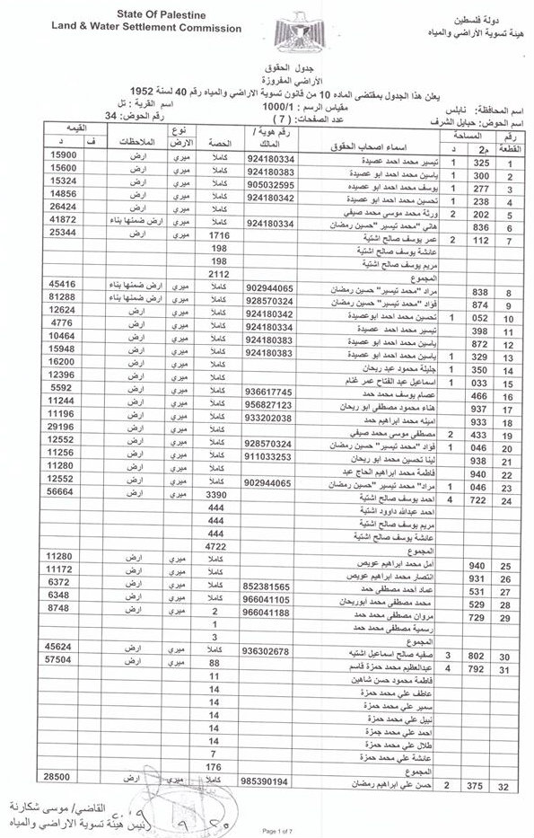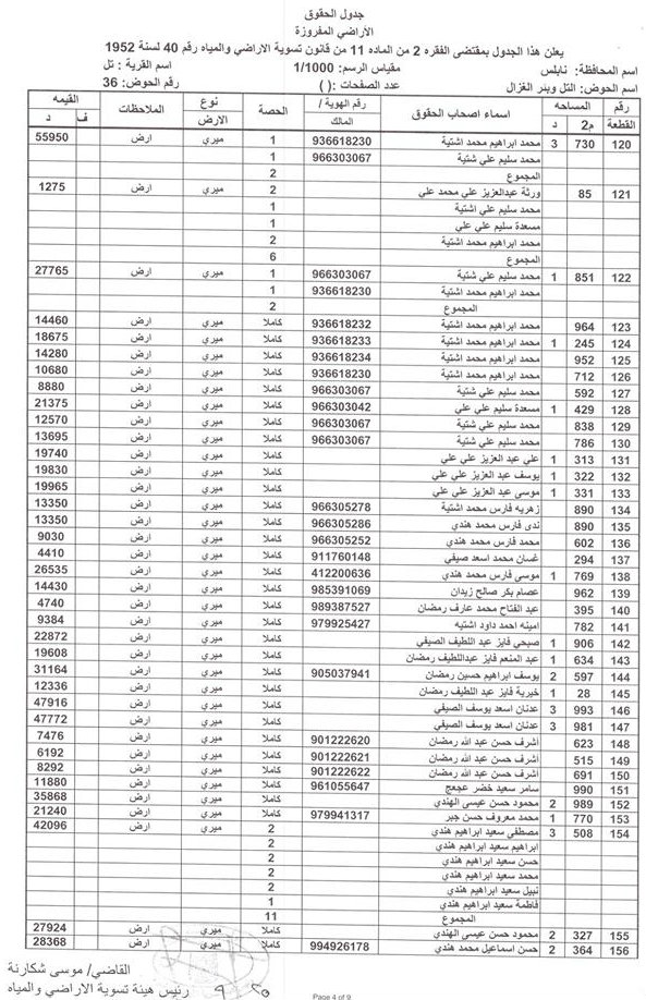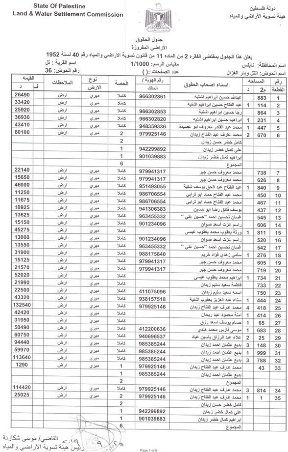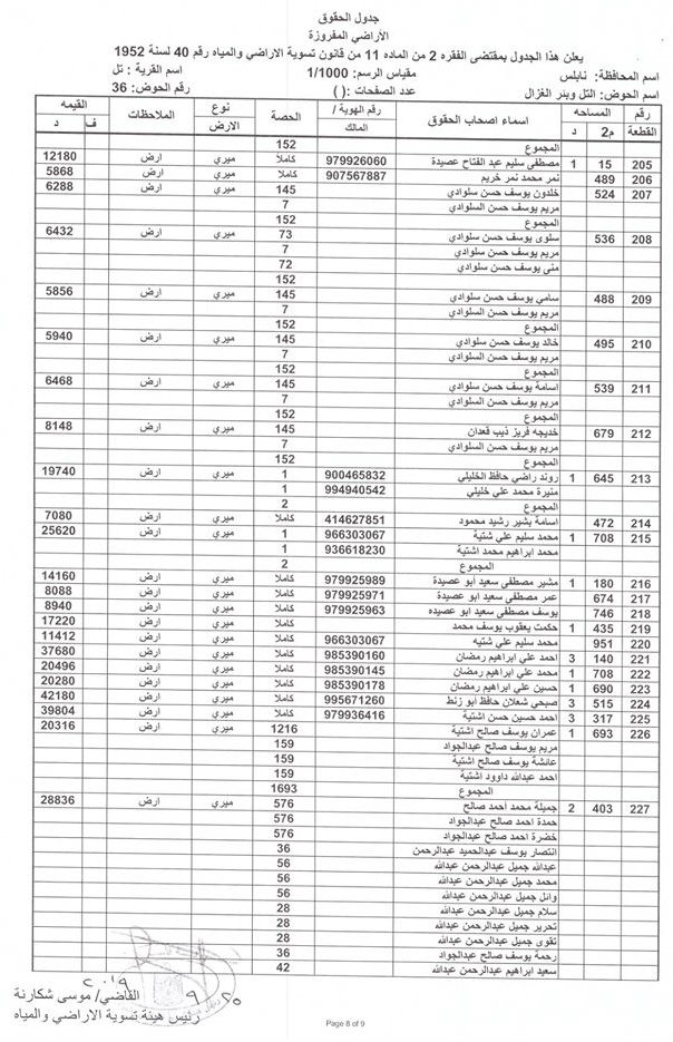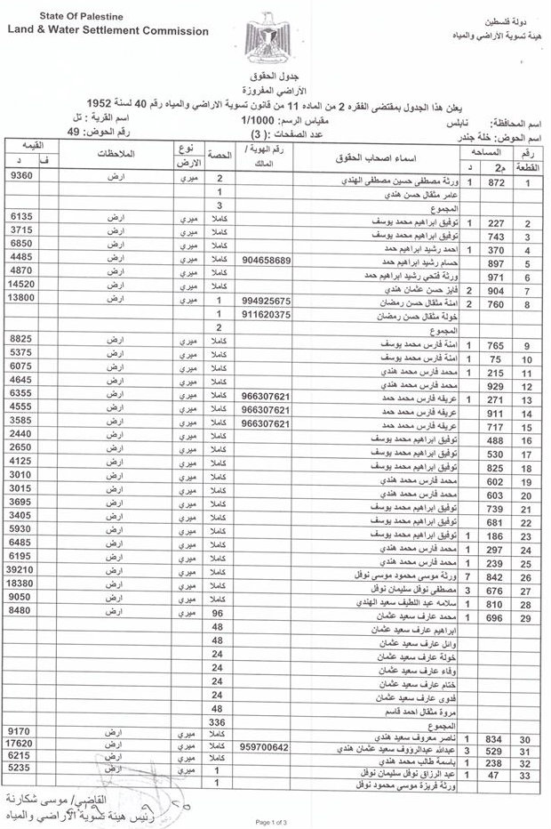 دائرة تسوية أراضي نابلس تعلق جداول الحقوق لأربعة أحواض في تل.