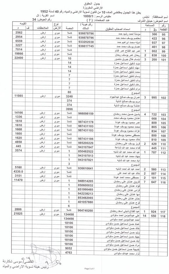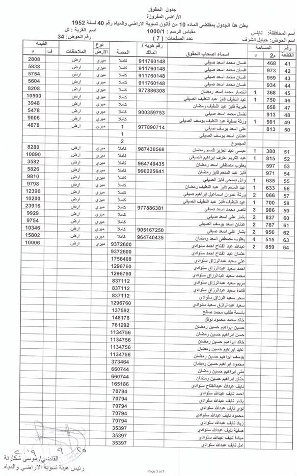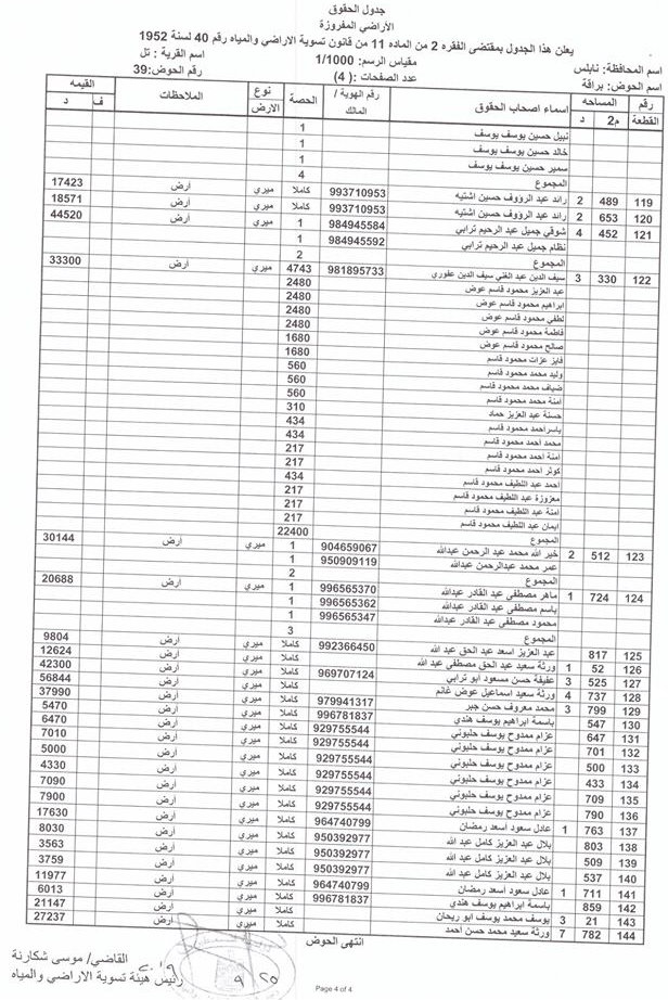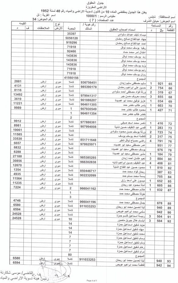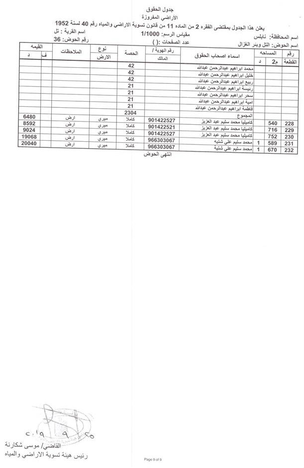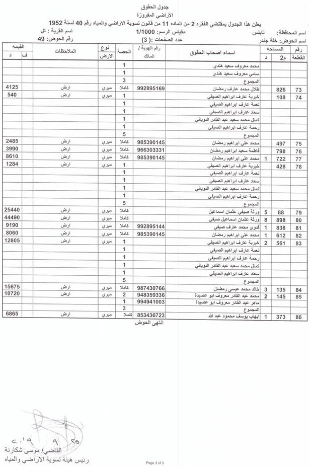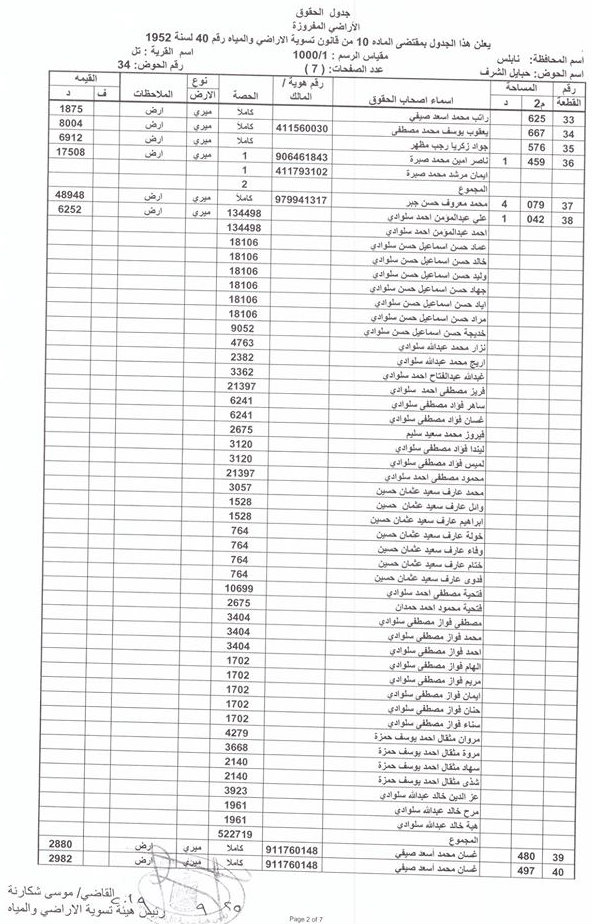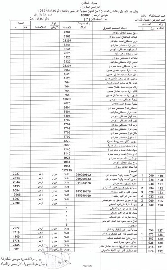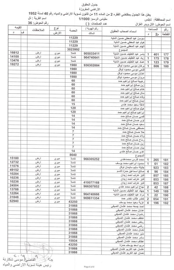 دائرة تسوية أراضي نابلس تعلق جداول الحقوق لأربعة أحواض في تل.