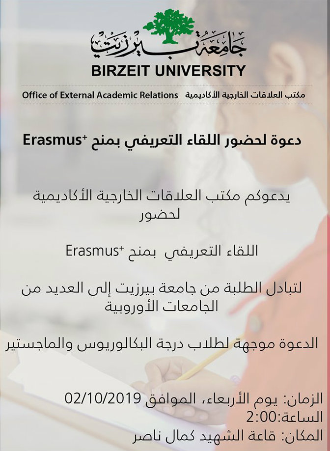 جامعة بيرزيت تدعو لحضور اللقاء التعريفي بمنح التبادل الطلابي Erasmus.