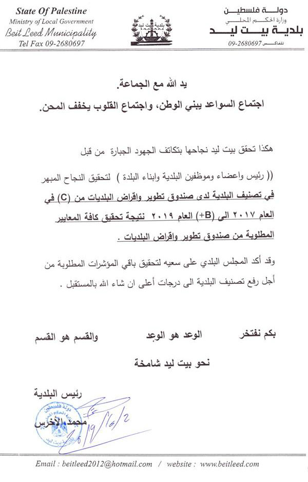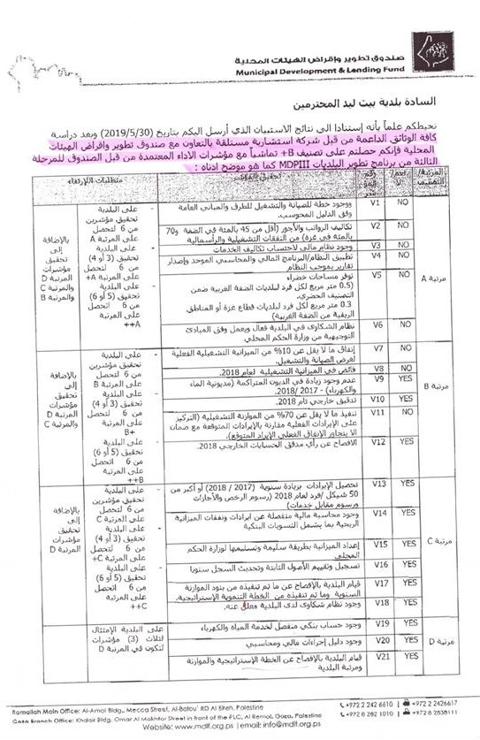 صندوق إقراض وتطوير البلديات يرفع تصنيف بلدية بيت ليد من C إلى B+.