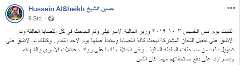 أعلن عضو اللجنة المركزية في حركة فتح حسين الشيخ عبر حسابه على تويتر، أنه التقى، أمس الخميس 03.10.2019، بوزير المالية الإسرائيلي وتم التباحث في كل القضايا العالقة والاتفاق على تفعيل اللجان المشتركة، لبحث كافة القضايا وستبدأ عملها يوم الأحد القادم.