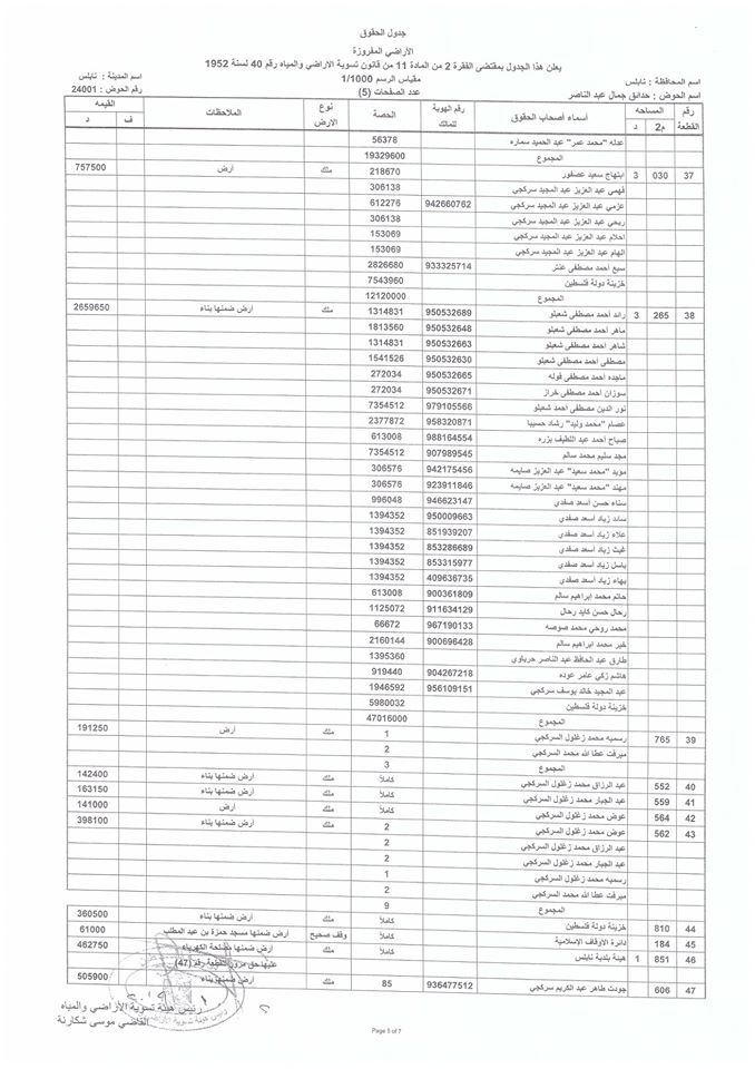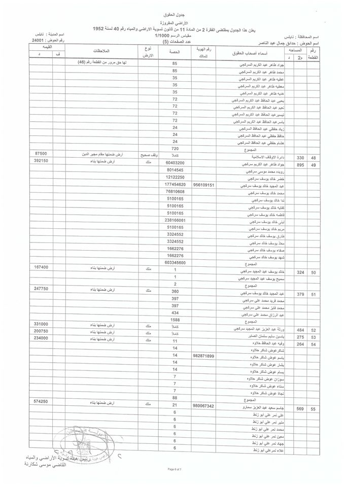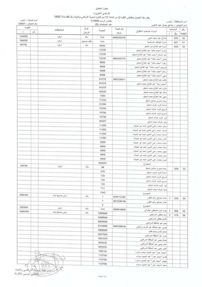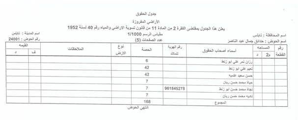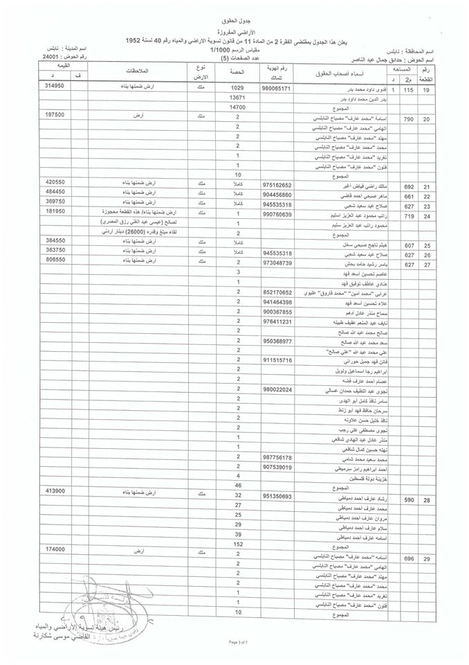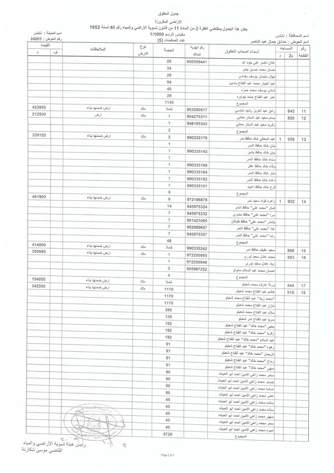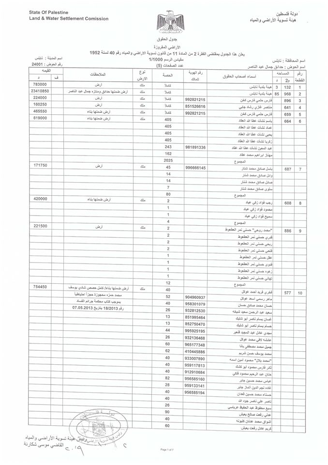 تسوية أراضي ومياه نابلس تعلن عن تعليق جداول حوض رقم 24001 والمسمى بحدائق جمال عبد الناصر.