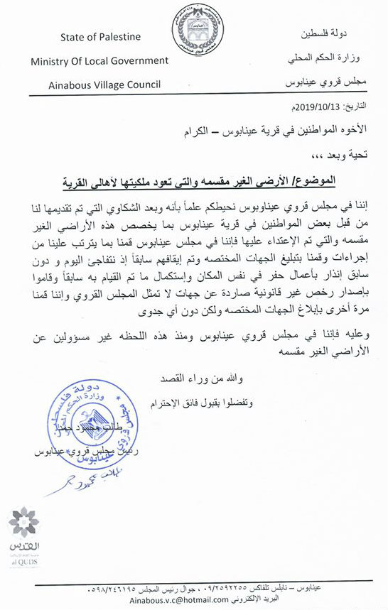 مجلس قروي عينابوس يخلي مسؤوليته من الأراضي غير المقسمة والتي جرى بها أعمال حفر من قبل البعض.
