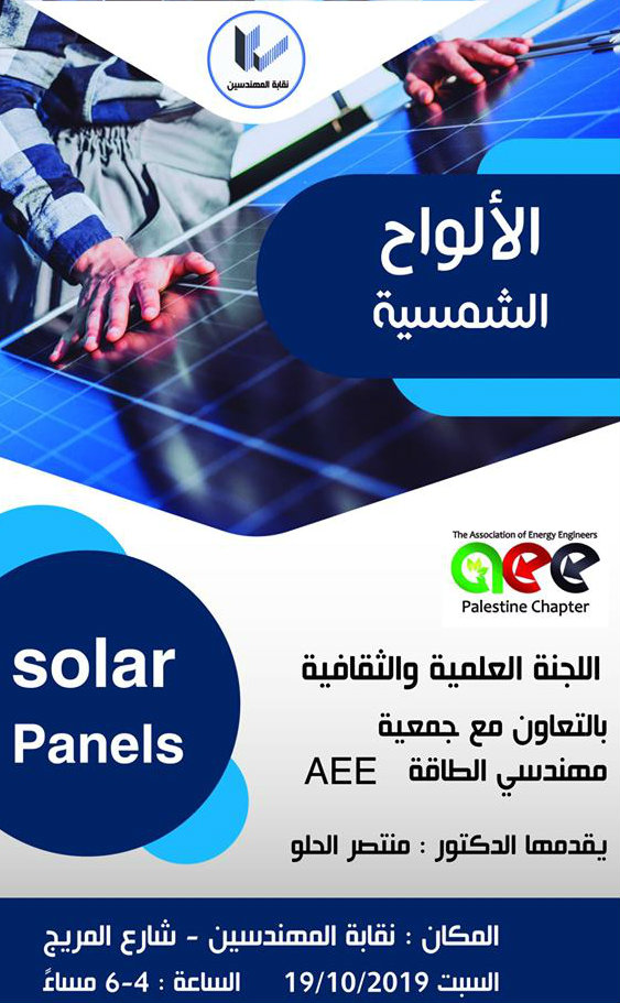 تنظم لجنة فرع نابلس/ اللجنة العلمية والثقافية بالتعاون مع جمعية مهندسي الطاقة ورشة عمل هامة بعنوان الألواح الشمسية Solar Panels.
