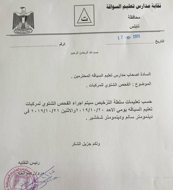 نقابة أصحاب مدارس تعليم السياقة في نابلس تعلن عن مواعيد الفحص الشتوي للمركبات.