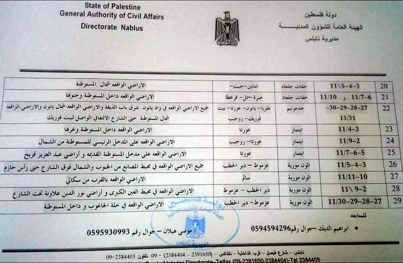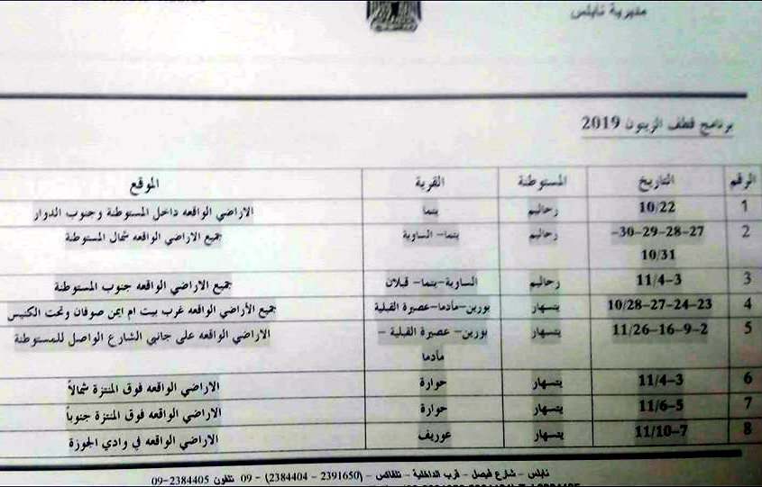 الهيئة العامة للشؤون المدنية في نابلس تنشر جدول قطف الزيتون في الاراضي المحاذية للمستوطنات بعد التعديل.