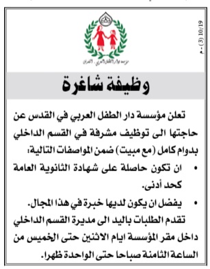 مطلوب مشرفة في مؤسسة دار الطفل العربي