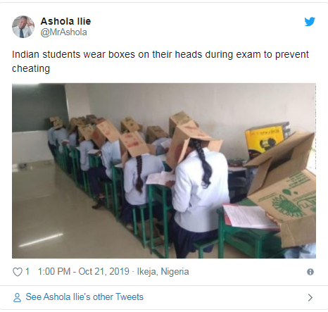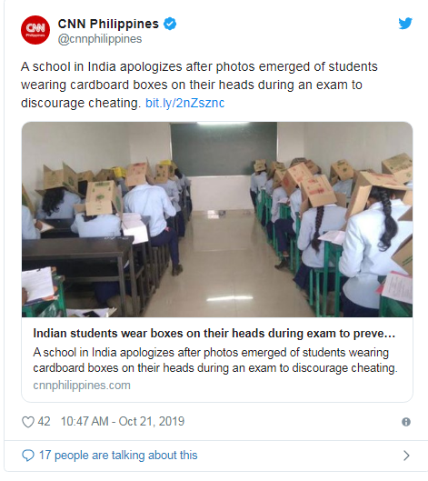 اعتذرت مدرسة هندية بعد انتشار صور لطلابها وهم يضعون رؤوسهم في صناديق من الورق المقوى خلال تأدية الامتحان، بغية ثنيهم عن الغش، الأمر الذي أثار موجة كبيرة من الانتقادات على وسائل التواصل الاجتماعي.