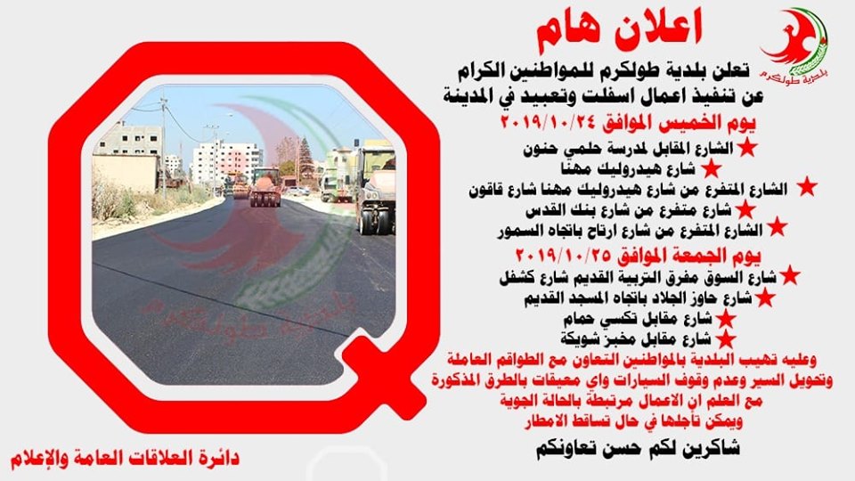 بلدية طولكرم تعلن عن شروعها بتعبيد شوارع وتهيب بالمواطنين عدم إيقاف سياراتهم ضمن مناطق العمل المحددة.