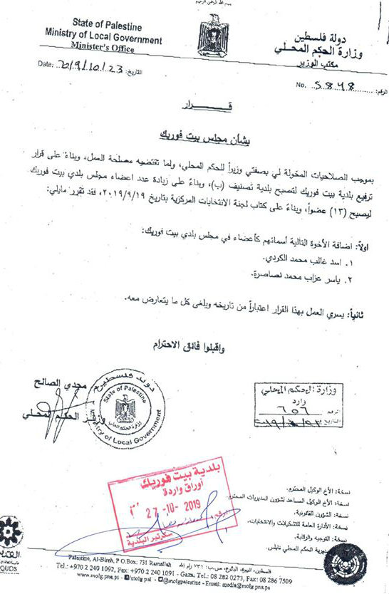 بلدية بيت فوريك تعلن أسماء عضوين إضافيين في المجلس البلدي.
