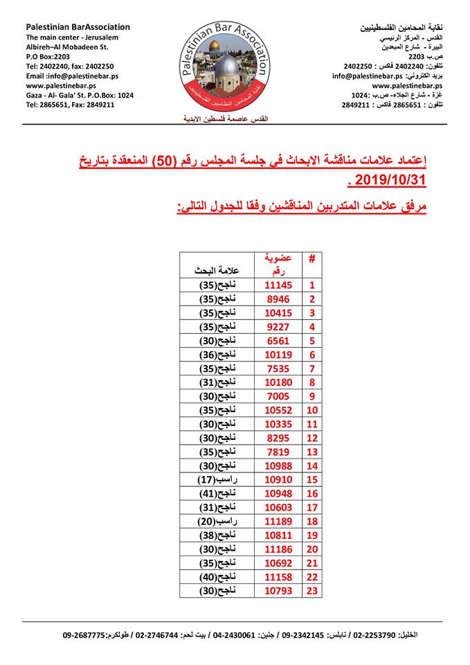 أعلنت نقابة المحامين، الأحد 03.11.2019، عن اعتماد علامات مناقشة الأبحاث في جلسة المجلس رقم (50) المنعقدة بتاريخ 31.10.2019، كما يلي: