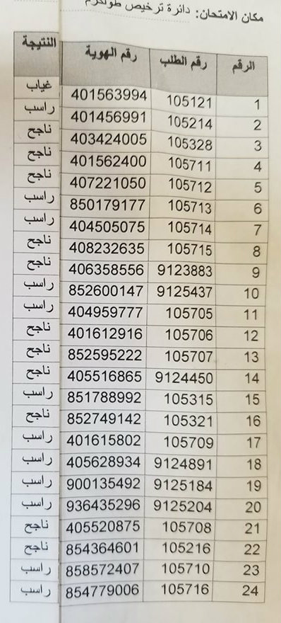 مديرية النقل والمواصلات في طولكرم تعلن عن نتائج امتحان السياقة العملي ليوم الثلاثاء 05.11.2019.