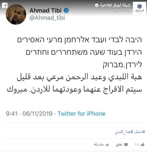أعلن النائب في الكنيست أحمد الطيبي في تغريدة على "تويتر"، الأربعاء 06.11.2019، أن السلطات الإسرائيلية ستُفرج بعد قليل عن الأسيرين الأردنيين هبة اللبدي وعبد الرحمن مرعي.