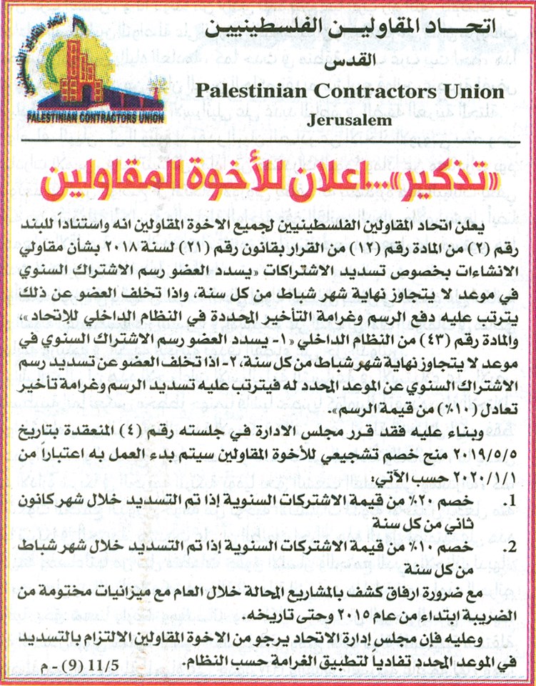 اتحاد المقاولين ينشر إعلاناً يبين فيه آلية سداد رسوم الاشتراك والخصومات.