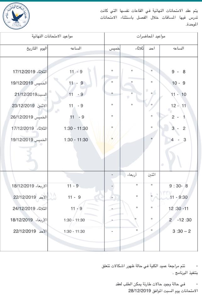 جامعة النجاح تعلن عن تعديل جدول امتحاناتها النهائية للفصل الدراسي الأول 2019/2020.