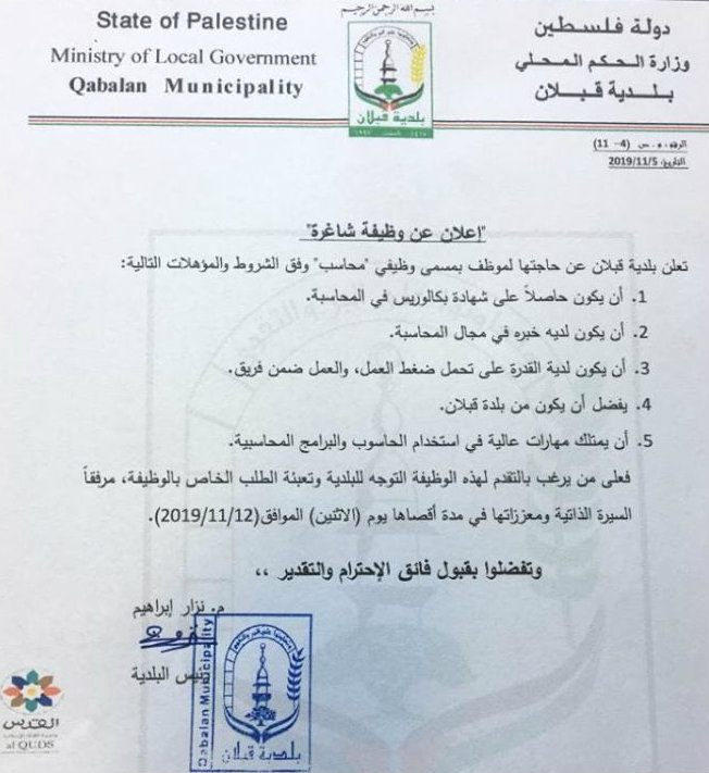 وظيفة شاغرة في بلدية قبلان