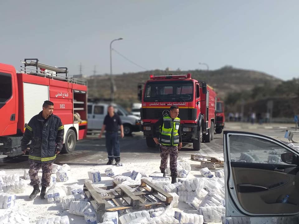 إطفائية بلدية نابلس والدفاع المدني والهلال الأحمر يتعاملون مع حريق قاطرة ومقطورة بعد انحرافها وانقلابها قرب مفرق جيت غربي نابلس نتج عنها 5 إصابات.