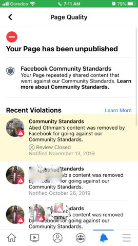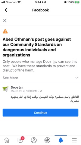 ولدى احتجاج إدارة دوز وسؤالها عن سبب الحجب، كان جواب فيسبوك أن دوز نشر خبراً يذكر "شخصاً أو منظمة خطيرة"، إضافة إلى نشر في عام 2017 فيديوهين اثنين فيهما موسيقى تعود حقوق ملكيتها الفكرية إلى شركة سوني.