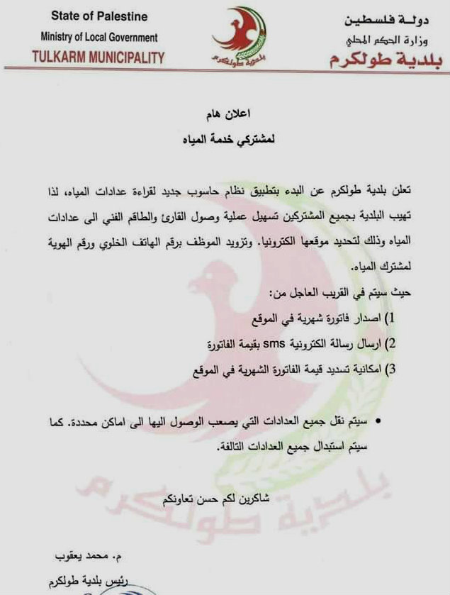 بلدية طولكرم تعلن عن تطبيق نظام إلكتروني جديد لقراءة عدادات المياه وتهيب بالمواطنين تسهيل مهمة الفنيين لتطبيق النظام.