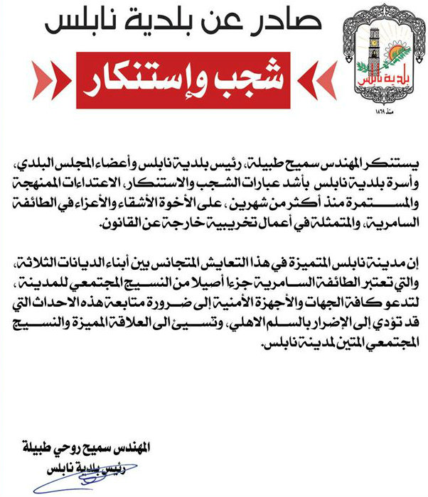 رئيس بلدية نابلس سميح طبيلة يستنكر أعمال التخريب والاعتداء على الطائفة السامرية بعد تكرار شكواهم.
