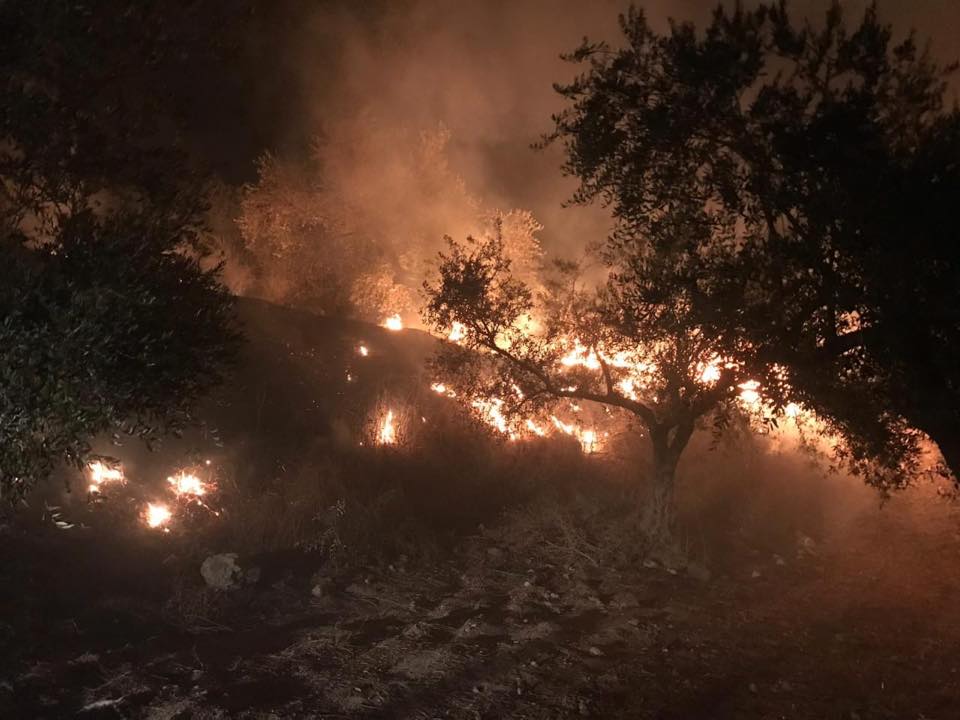 مستوطنون يضرمون النار بأشجار زيتون في سبسطية شمال غرب نابلس.